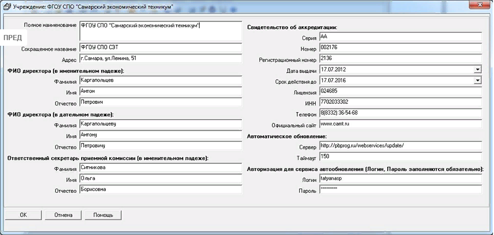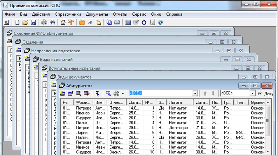 Приемная комиссия: СПО – программа для автоматизации работы приемной комиссии организаций среднего профессионального образования (колледжей, техникумов). Организуйте приемную комиссию в колледже или техникуме – программа обеспечивает выполнение всех необходимых операций по приему документов (в т. ч. сертификатов ЕГЭ), поиску и анализу информации, составлению рейтингов и отчетов, имеется автоматическое зачисление.