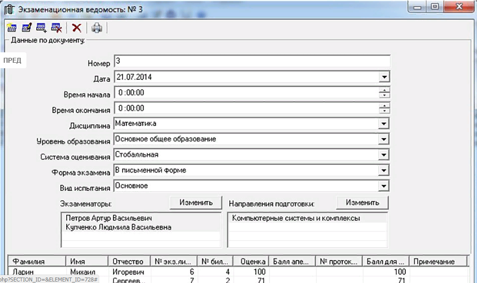 - Формирование и печать экзаменационных и рейтинговых (сводных) ведомостей.