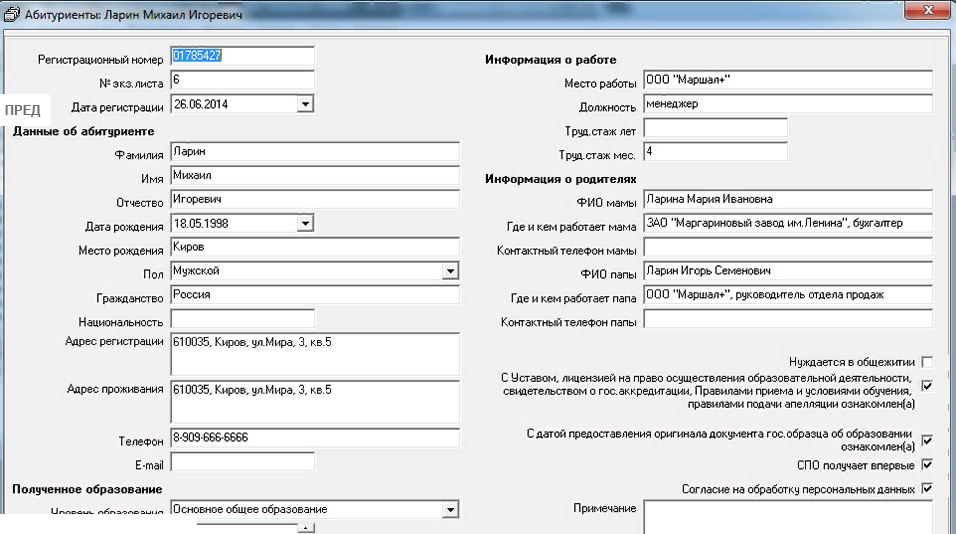 Программа для автоматизации работы приемной комиссии колледжей и техникумов. Обеспечивает выполнение всех необходимых операций по приему документов, поиску и анализу информации, составлению отчетов.