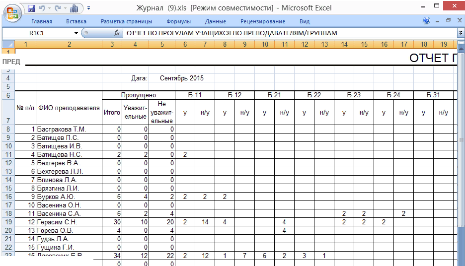 - Печать отчета по прогулам: отчет по прогулам студентов в разрезе групп, отчет по прогулам студентов в разрезе преподавателей, отчет по прогулам студентов, выбранной группы.