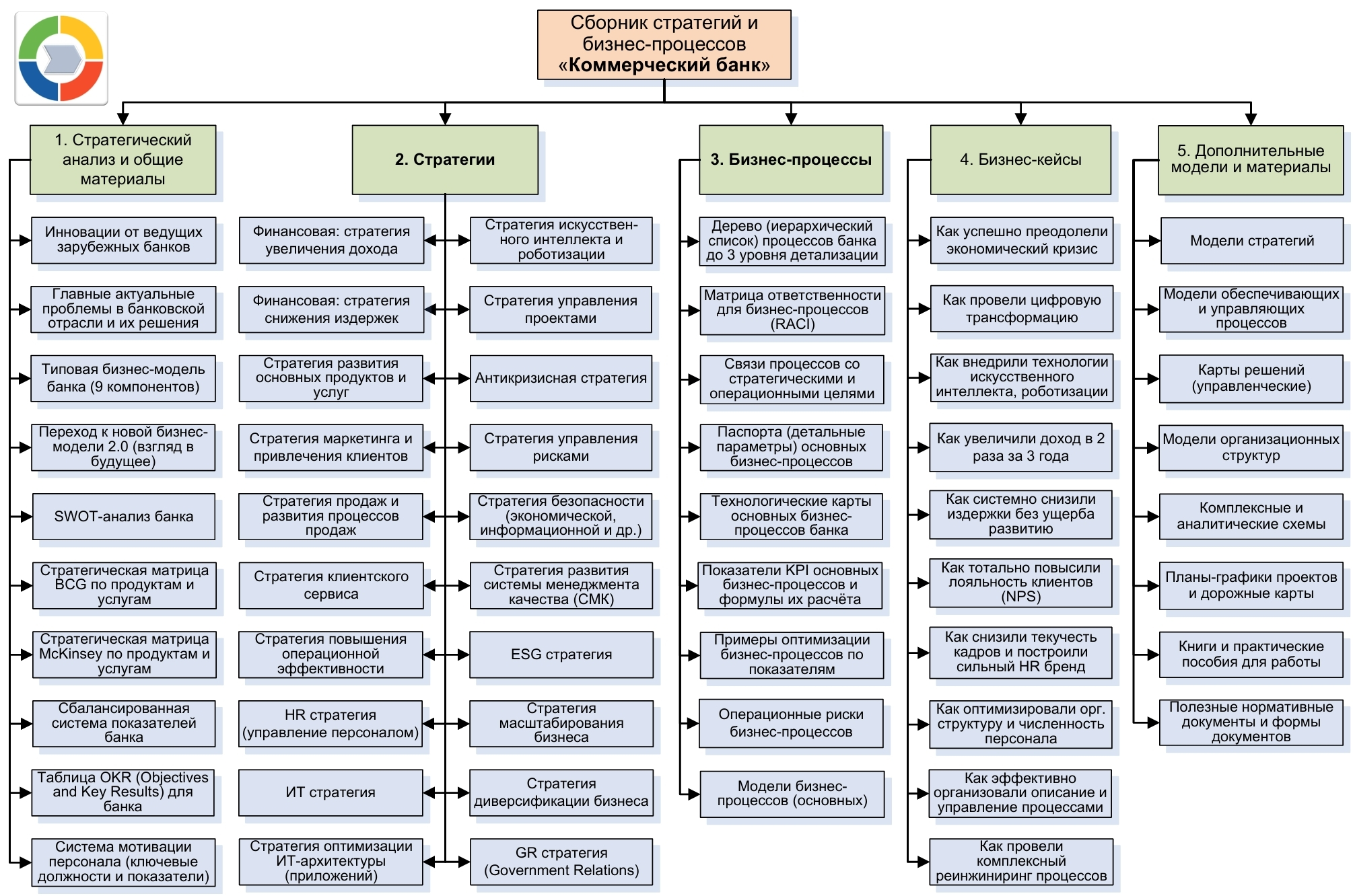 Сборник стратегий и бизнес-процессов «Коммерческий банк» (далее — Сборник) включает материалы, которые необходимы для разработки эффективных стратегий развития, бизнес-процессов, показателей KPI, внутренних нормативных документов с учётом специфики банковской отрасли и лучших отраслевых практик.