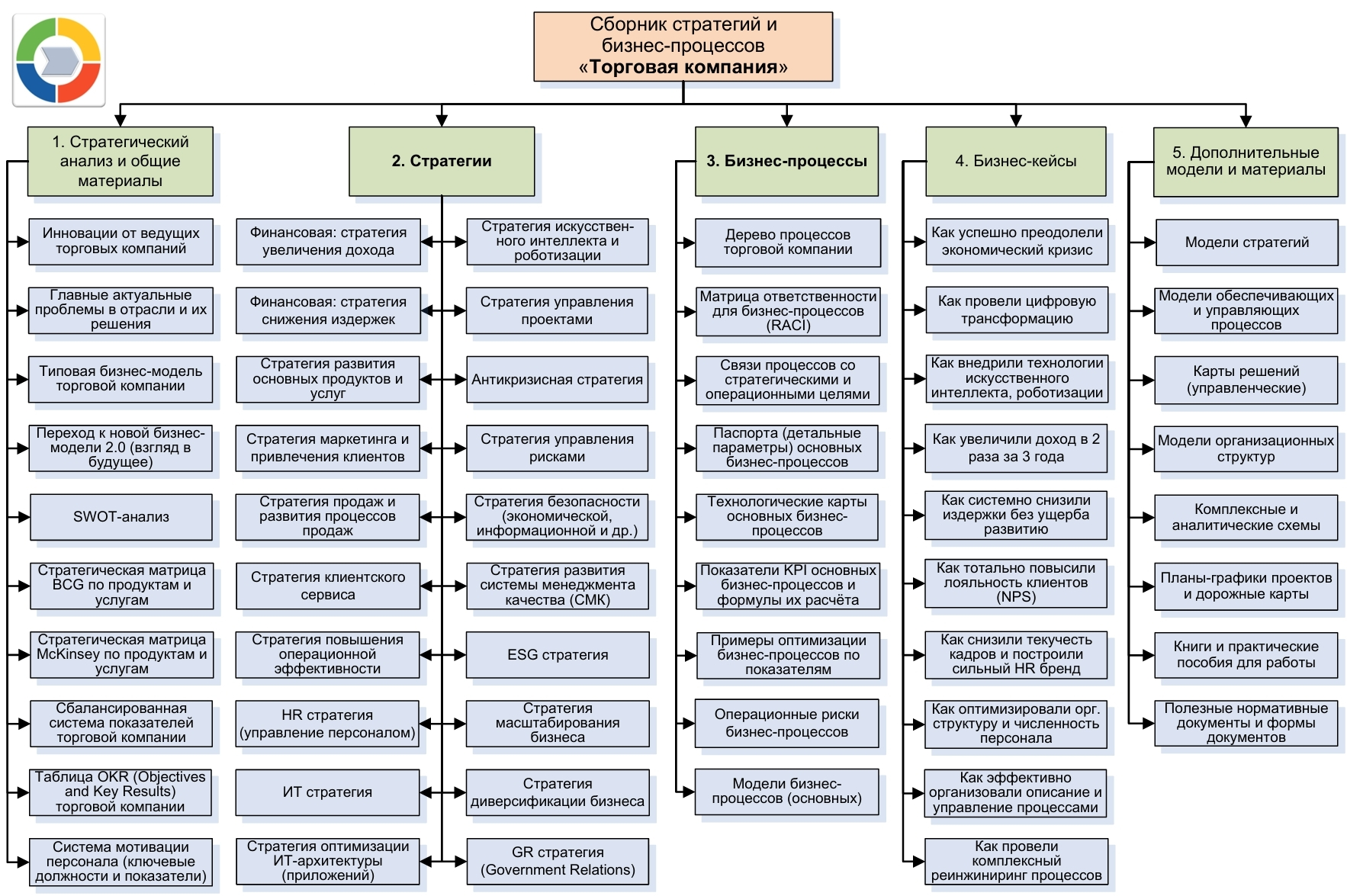 Сборник стратегий и бизнес-процессов «Торговая компания» (далее – Сборник) включает материалы, которые необходимы для разработки эффективных стратегий развития, бизнес-процессов, показателей KPI, внутренних нормативных документов с учётом специфики отрасли и лучших отраслевых практик.